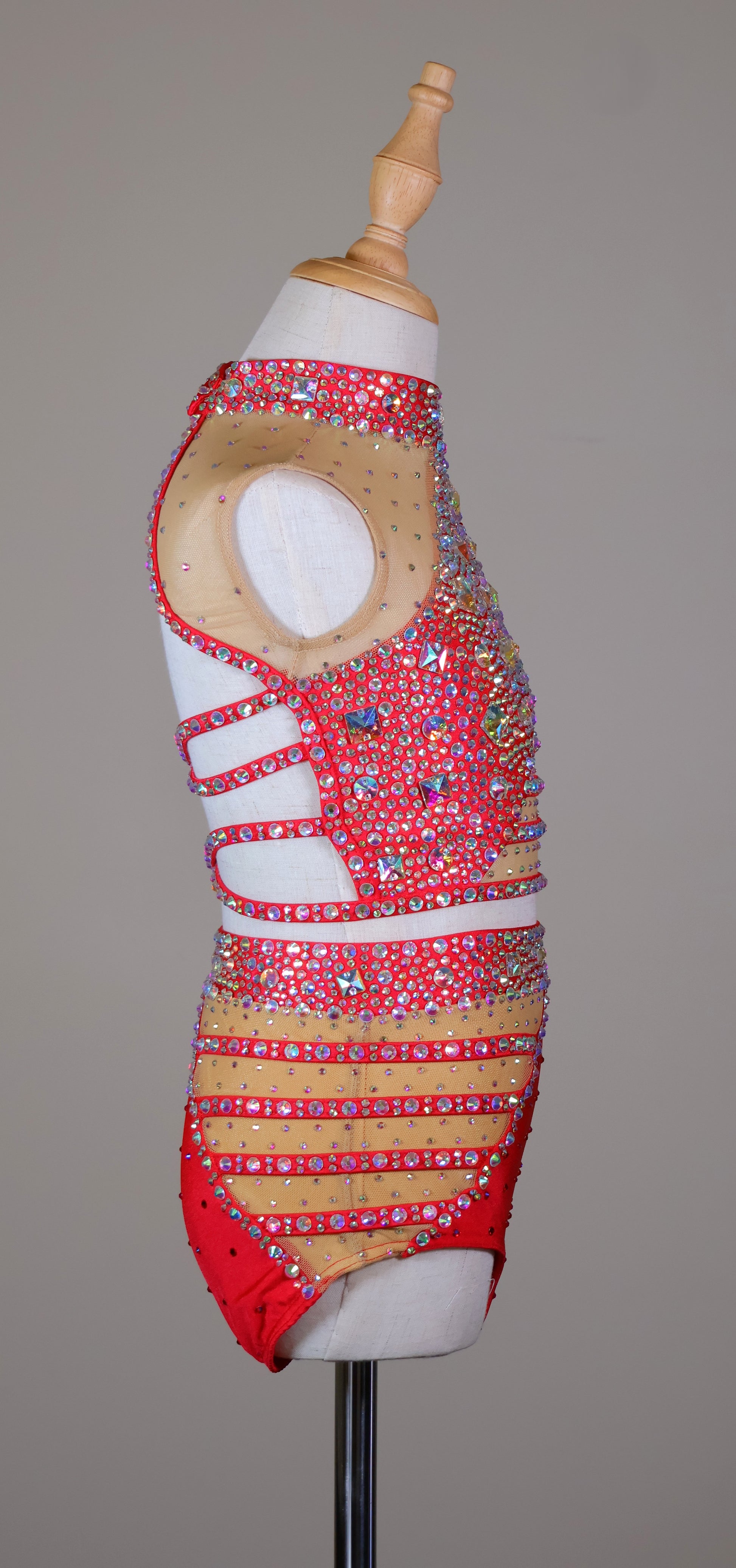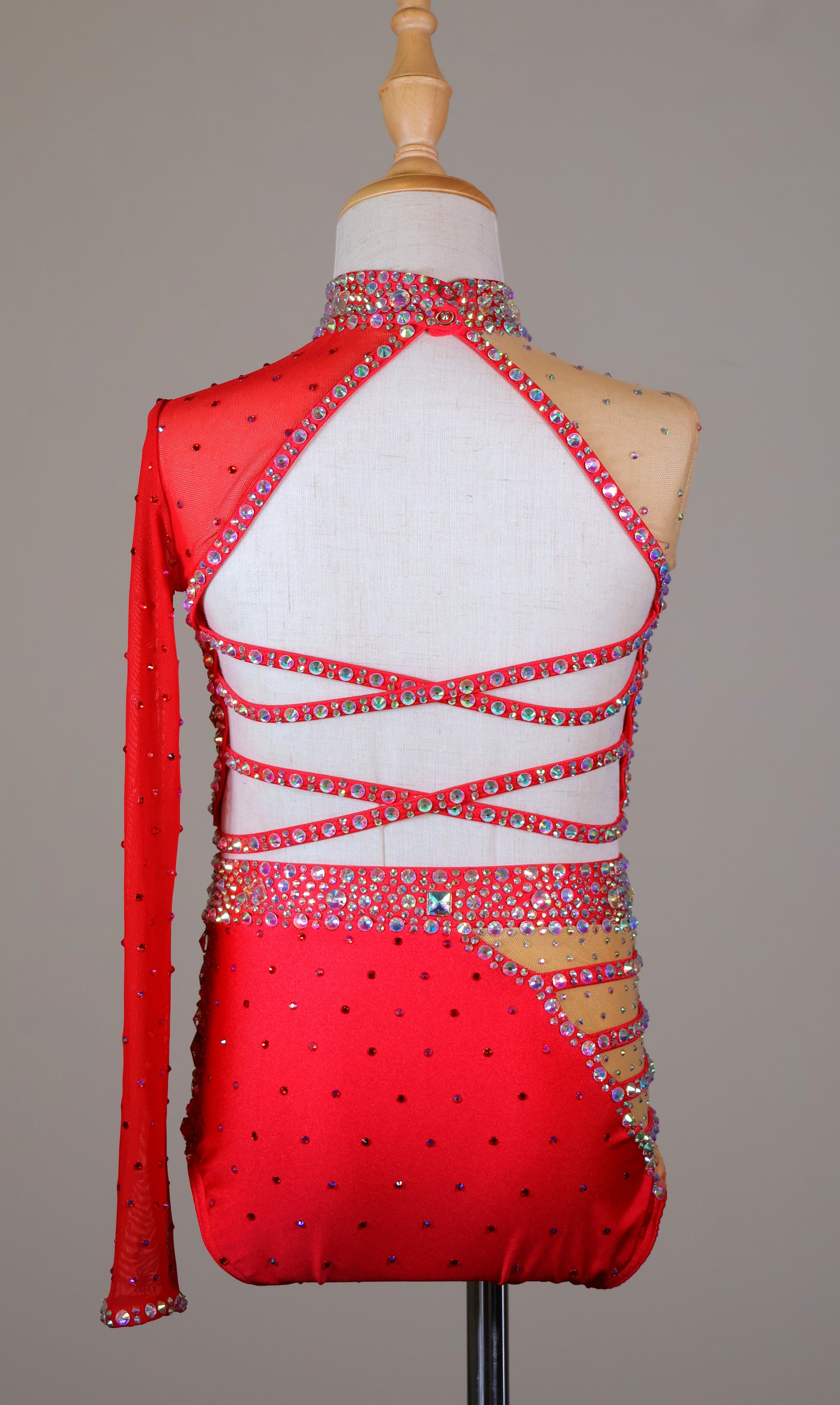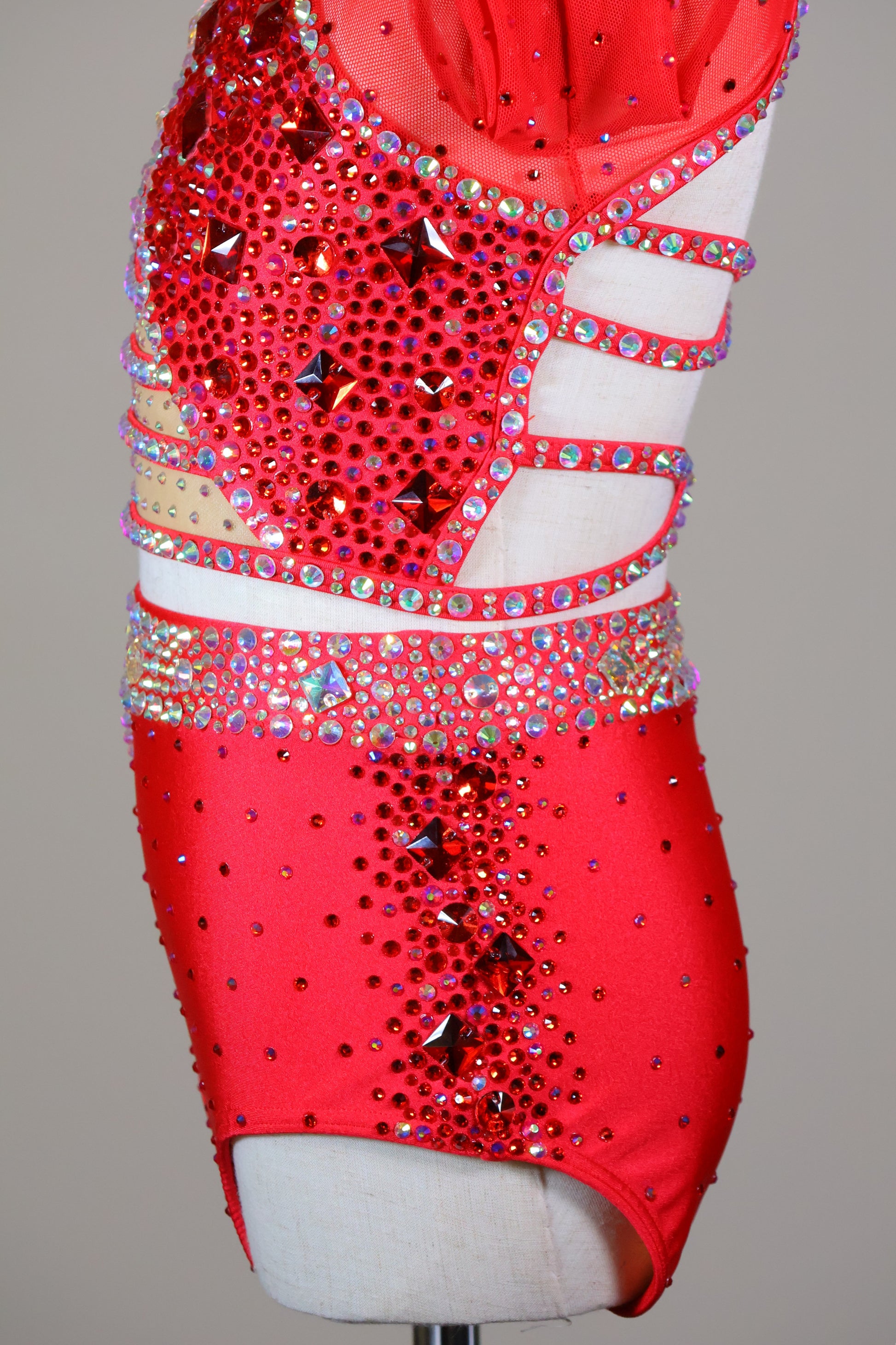 Colour/Fabric: Red spandex with red mesh sleeve and nude mesh inserts. Crystal AB, Siam and Siam AB gems.