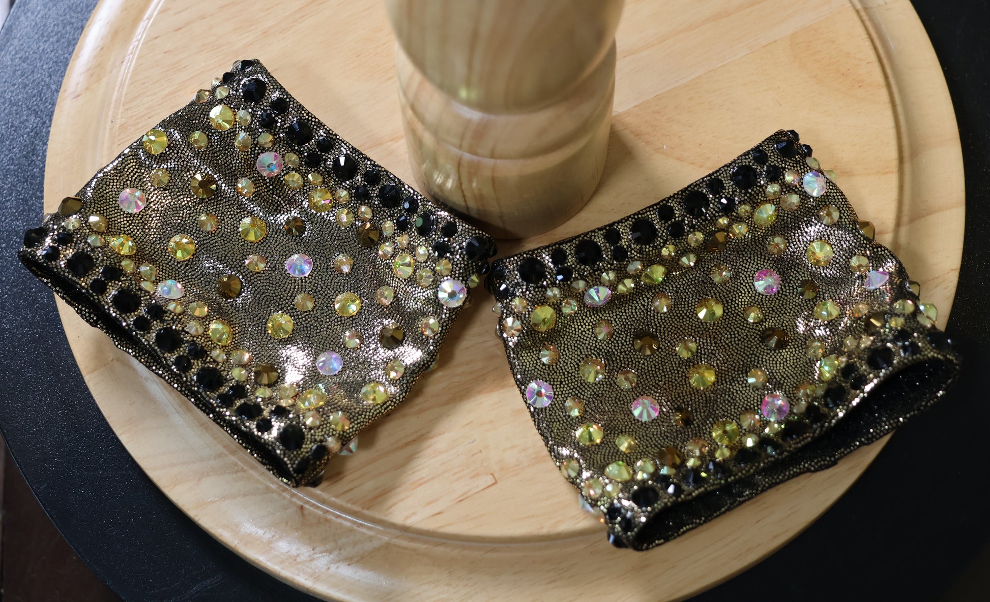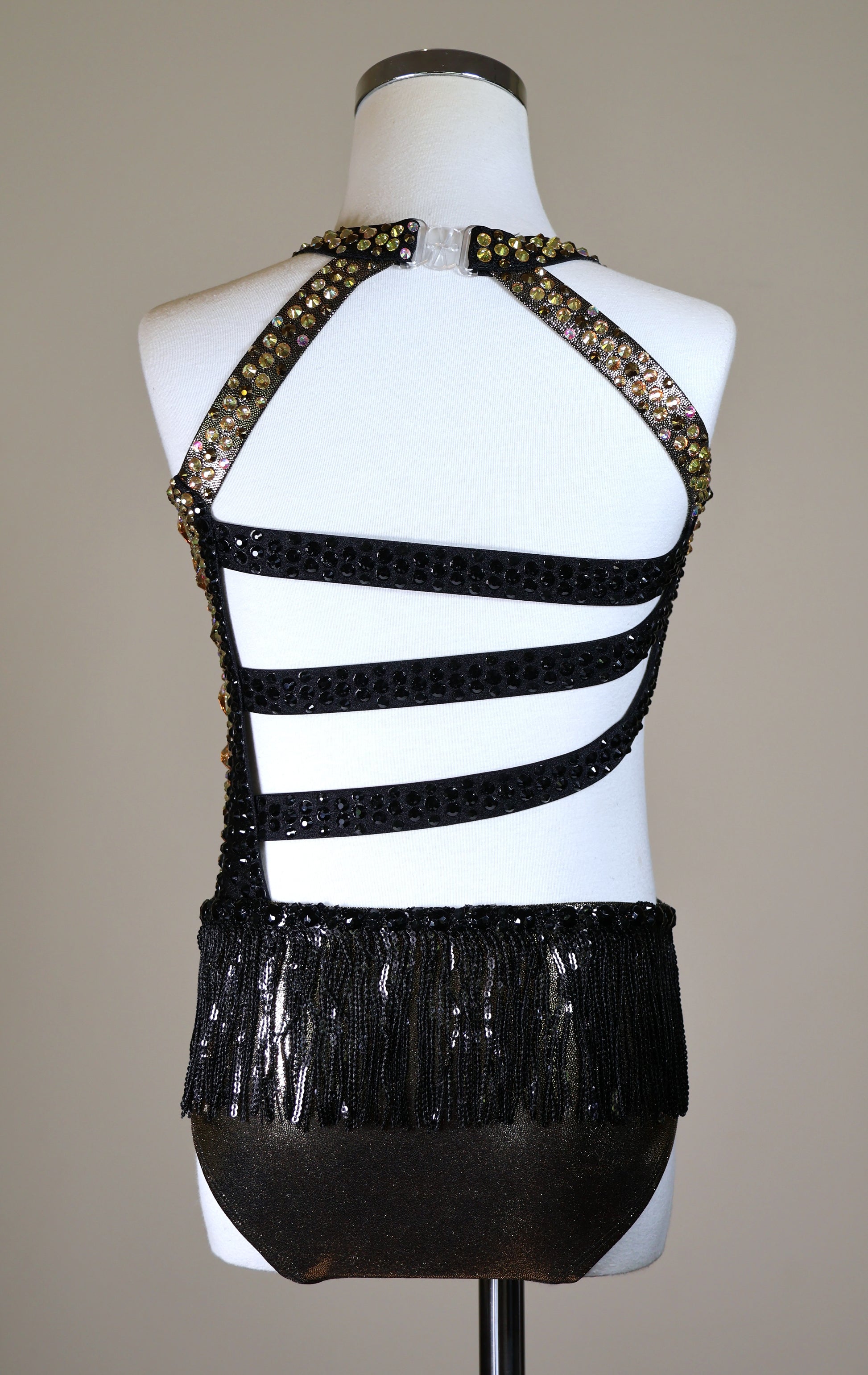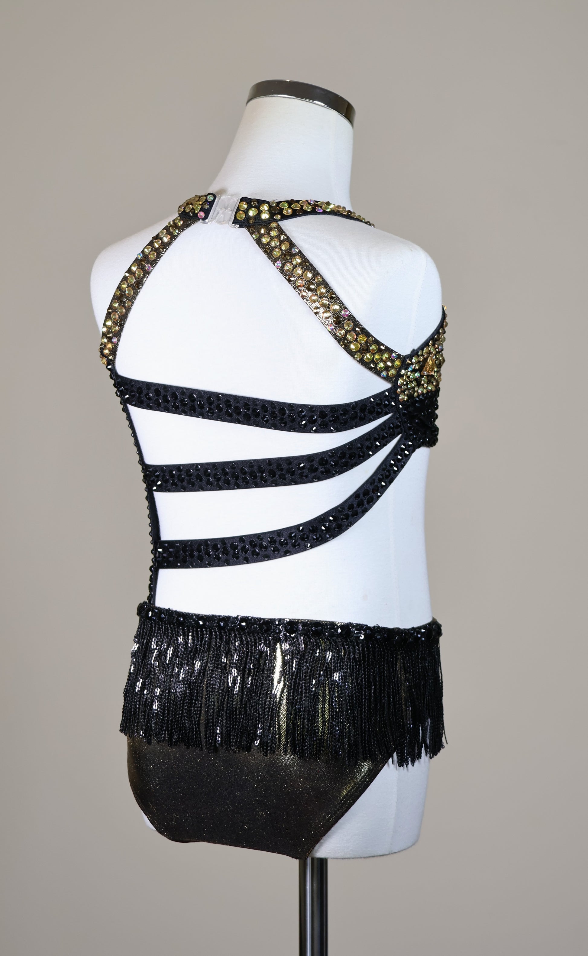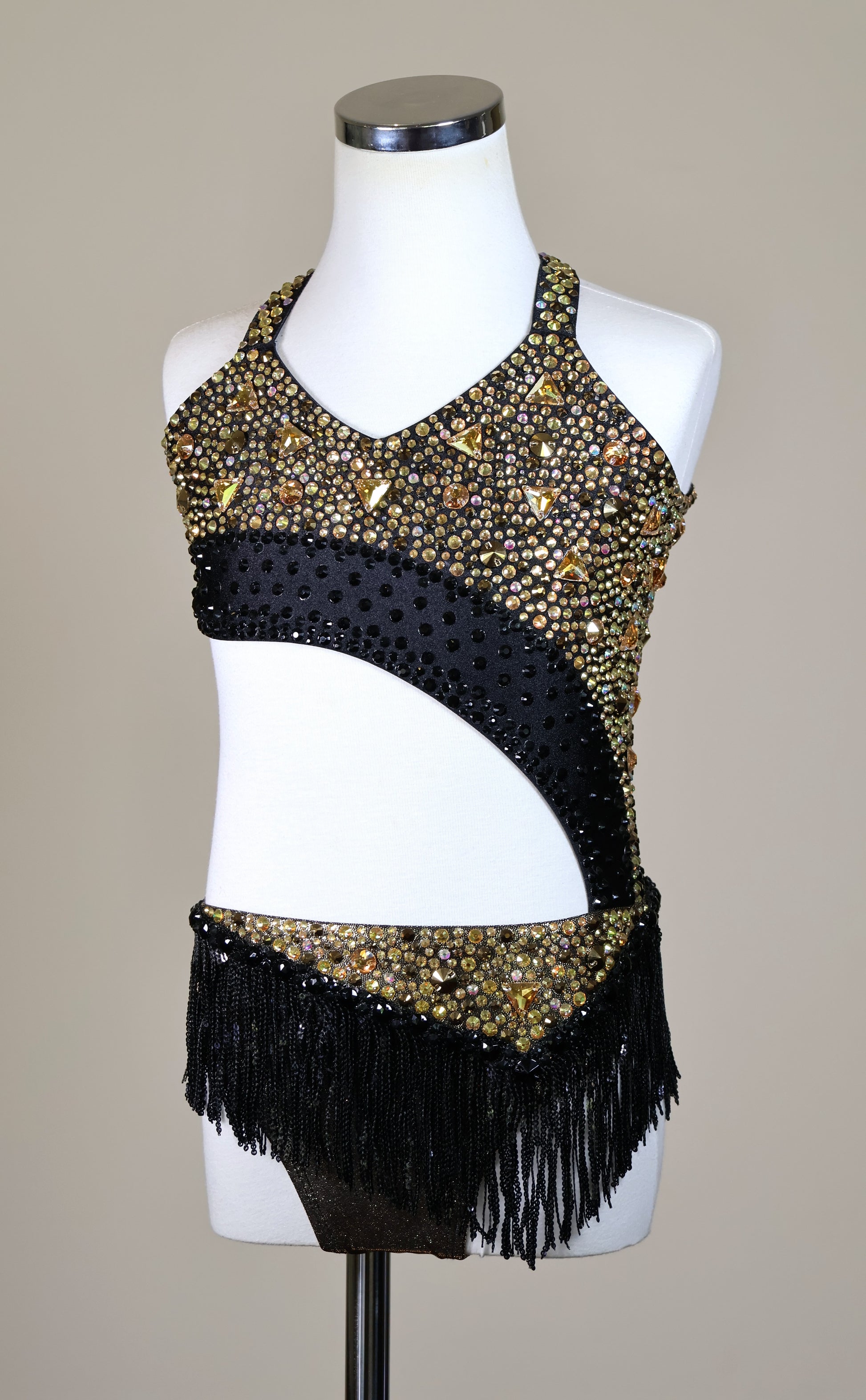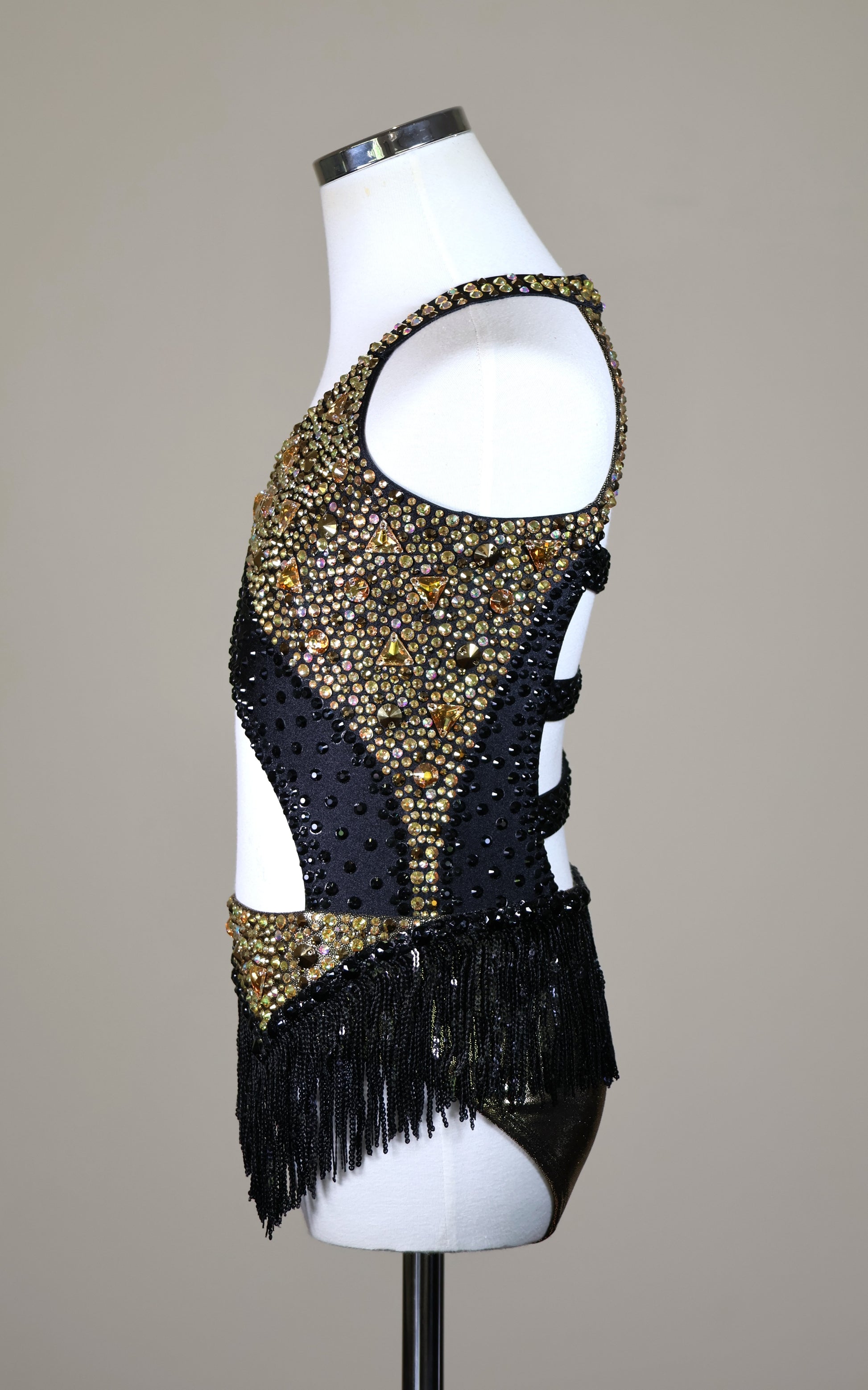 Colour/Fabric: Shiny black and metallic black/gold spandex. Sunshine, Mine Gold, Jet Black and Crystal AB gems. Sequin trim skirt.