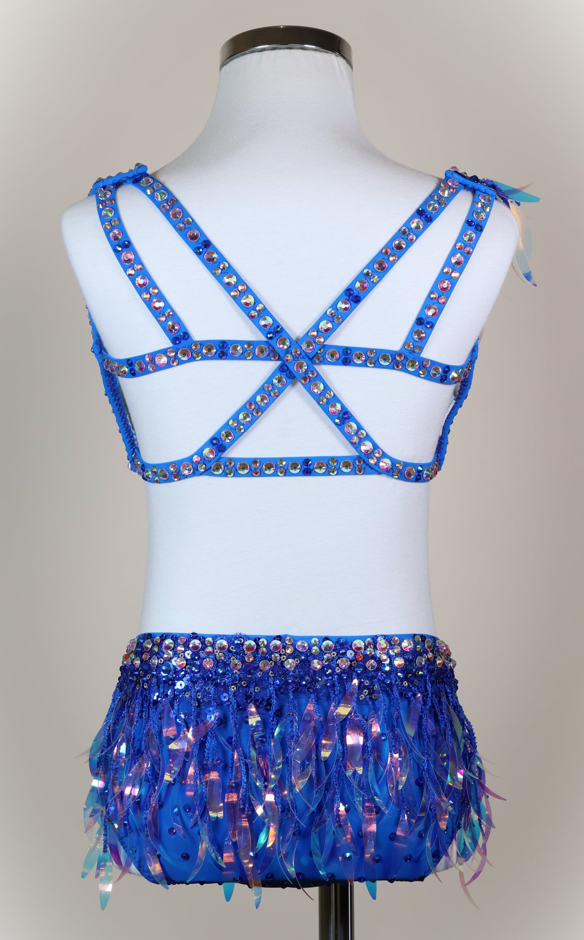 Colour/Fabric: Blue matte spandex. Sapphire AB, Champagne AB and Crystal AB gems. Blue/orange trim.